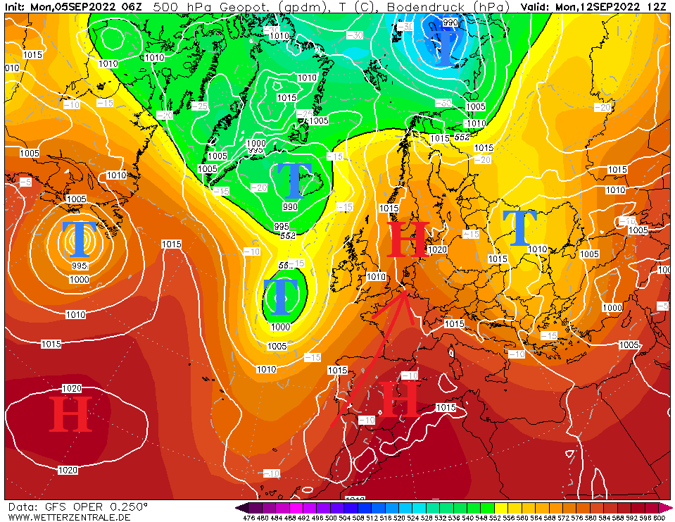 Ich greife etwas vor und vielleicht habe ich mich auch etwas weit aus dem Fenster gelehnt. Ist der Sommer vielleicht doch noch nicht vorbei? Der Hauptlauf vom GFS macht etwas, was es schon den gesamten Sommer über gemacht hat. Ein Hoch über der Nordsee, ein Hoch über dem Mittelmeerraum, ein Tief vor den britischen Inseln und abermals eine südliche Strömung mit sehr milden Temperaturen, stabilem Wetter und wenig Niederschlägen. Wir sehen gleich aber auch, dass der Hauptlauf damit etwas alleine damit steht.
