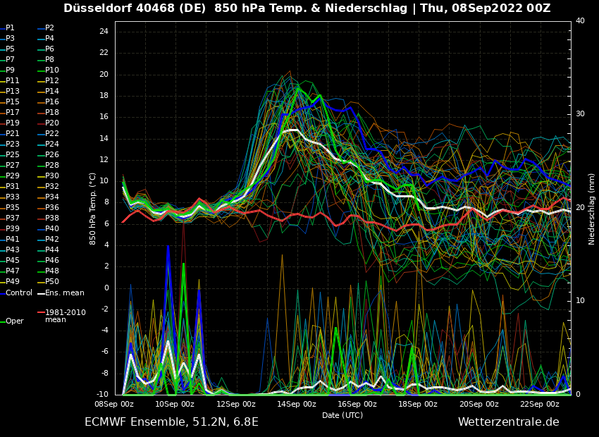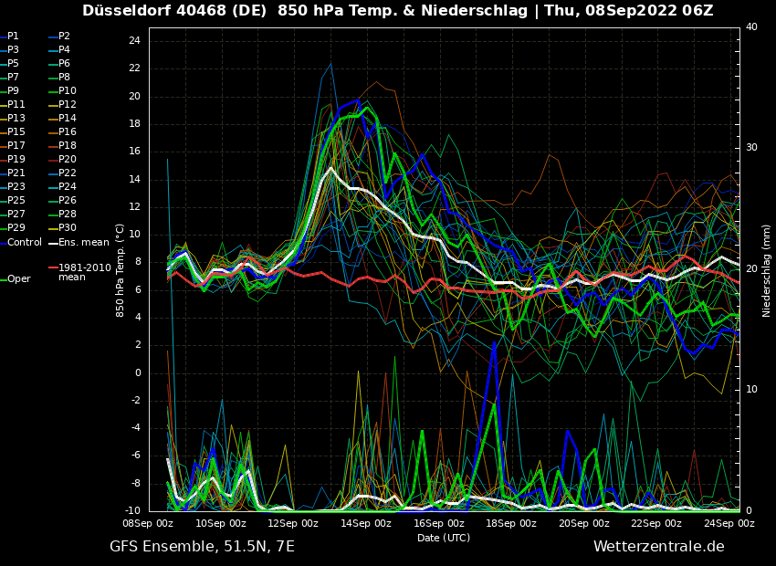 Dementsprechend gestaltet sich auch das Ensemble. Zunächst viele Schauer bis Samstagnachmittag, danach wird es ruhiger und zum Montag spürbar wärmer bis heiß. Danach legen die Schauer wieder los und es kühlt sich wieder ab. Weiterhin scheint es zu Ende September trockener zu werden.