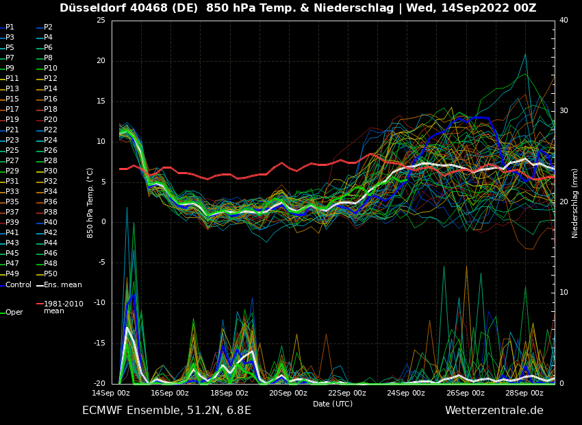 Das ECMWF sieht das ziemlich ähnlich, die trockene Phase ist hierbei vom 21.-24. September. Temperaturen gestalten sich ebenso ähnlich, sodass aktuell wenig Spekulationsspielraum für mehr ist. Auch mal ganz schön.