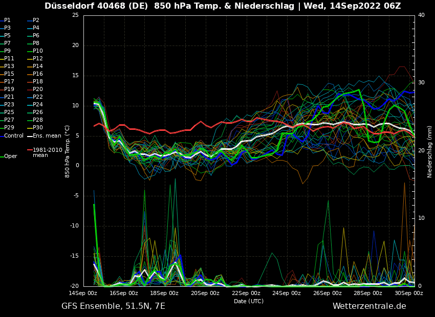 Die Schauer sind hier auch ganz gut abgebildet, zumindest bis zum 21. September, also nächste Woche Mittwoch. Ab dann soll es trocken werden und auch erstmal trocken bleiben, die ersten Schauer gibt es dann vermutlich ab dem 26. September wieder. Die Luftmasse ist dazu zunächst kühl, danach wird es wieder wärmer. Genaue Richtung ist allerdings noch unklar.