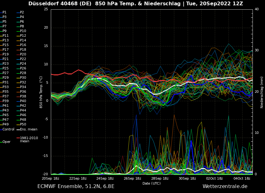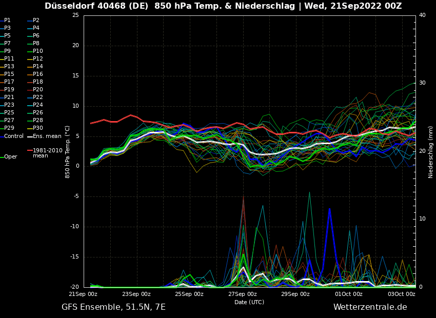 Das sehen wir auch ganz eindrucksvoll am Ensemble. Plötzlich gibt es eine Kerbe rund um den 28. September, was die Temperaturen angeht. Viele Modelle, die ohnehin schon unterdurchschnittliche Temperaturen berechnen, sacken nochmal richtig ab und die Niederschläge gehen dafür rauf. Allerdings wird auch an einer trockeneren und wärmeren Witterung rund um den Tag der deutschen Einheit gebastelt.