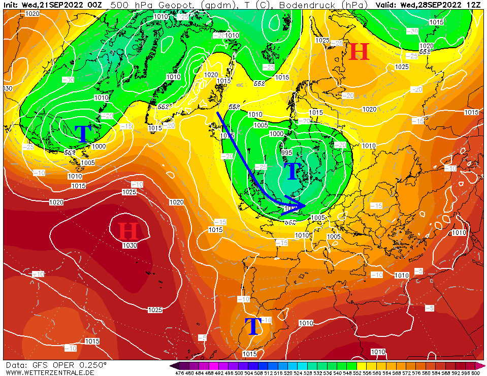 Einen Tag später und es bleibt das Schauerwetter bestehen, aber: Das Hoch auf dem Atlantik wird etwas kräftiger berechnet, verlagert sich etwas nach Norden und somit soll die Strömung nicht mehr auf Südwest stehen, sondern auf Nordwest drehen. Das bedeutet einerseits, dass das Wetter ne deutliche Spur frischer wird, zum anderen auch mehr Regen- und weniger Schaueranteil am Niederschlag. Diese Wetterlage wäre ähnlich wie vergangenes Wochenende richtig ungemütlich herbstlich mit Wind, Regen und teils kräftigen Schauern aufgrund von Höhenkaltluft.
