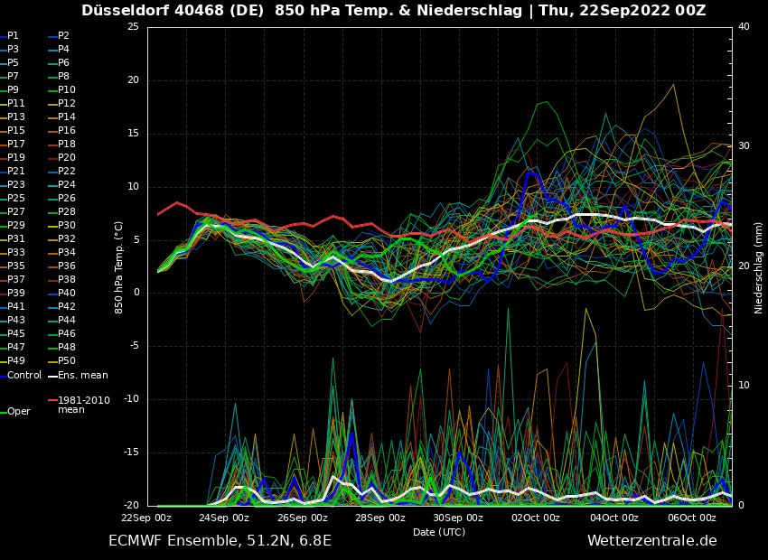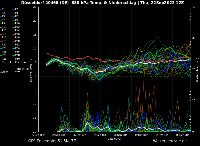 Mit Blick auf die Ensembles werden wir nun erstmal eine niederschlagsreiche Phase sehen, die mit großer Wahrscheinlichkeit am Samstag, spätestens am Dienstag nächster Woche beginnen wird. Dann gibt es wieder viele Niederschläge gepaart mit kühlen Temperaturen und Wind. Zum Ende der ersten Oktober-Dekade soll sich das Wetter nur etwas stabilisieren, wird aber in den Ensembles angedeutet.