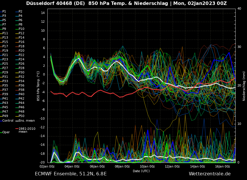 Das zeigt sich auch im Ensemble des GFS wieder. Erstmal der Blick auf die Niederschlagssignale, denn diese sind recht aktiv über den gesamten Vorhersagezeitraum, erst zum 14. Januar wird das etwas ruhiger. Außerdem bewegen sich die Temperaturen in 1.500 Meter stetig auf und ab. Das deutet auf abwechselnde Kalt- und Warmfronten hin, was auch bedeutet, dass immer wieder Wind diese verschiedenen Luftmassen ausräumt. Auch hier gehen die Temperaturen ab dem 14. Januar so allmählich zurück. Da können wir das nächste Mal genauer drauf blicken.