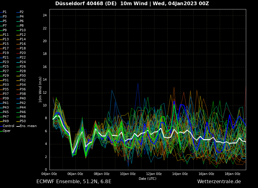 Wichtig ist hierbei häufig die dicke grüne und blaue Linie, die den Haupt- bzw. Kontrolllauf symbolisieren, die mit den besten Berechnungsgrundlagen ausgestattet sind.