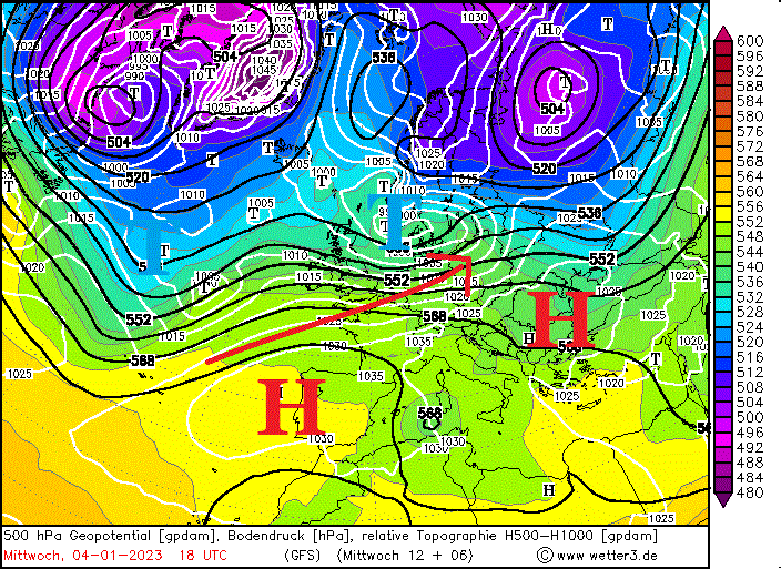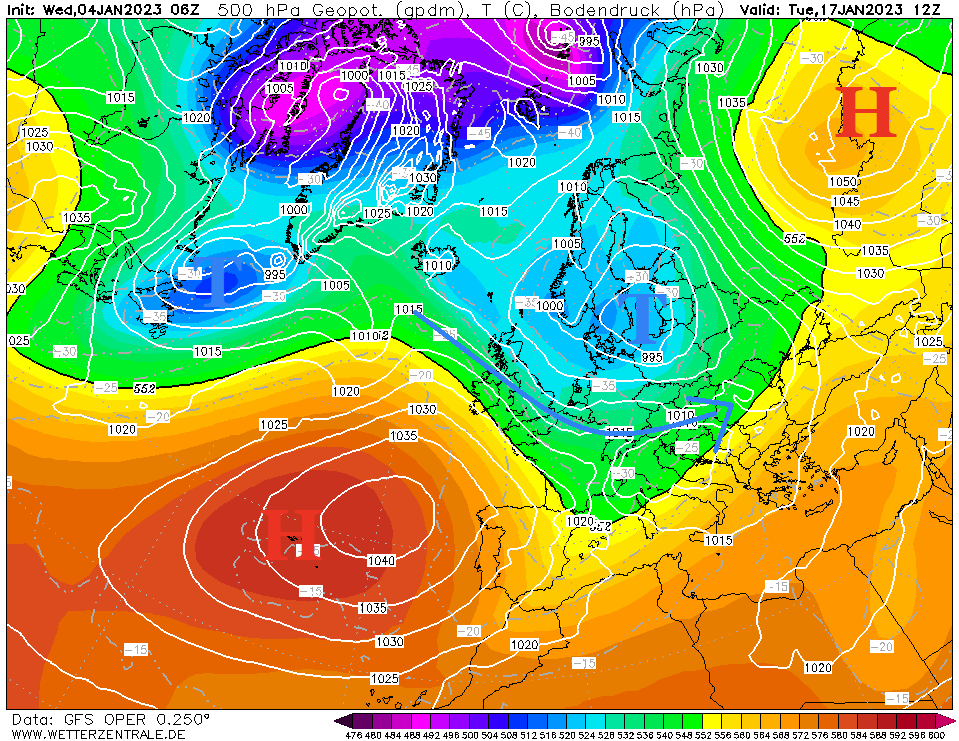 Ich schwenken unseren Blick heute mal in Richtung Mitte Januar. Nach den aktuellen Prognosen soll diese anhaltende Sturmlage bis zum 17. Januar anhalten. Deshalb halten wir auch genau an dieser Stelle an und blicken einmal auf die dazugehörige Großwetterlage, berechnet vom Hauptlauf des amerikanischen GFS. Da hätten wir einmal ein kräftiges Azorenhoch, ein kräftiges Kontinentalhoch über Sibirien, ein Tief über der Ostsee und ein Tief draußen auf dem Atlantik. Diese Großwetterlage zeigt zum einen eine Sollbruchstelle zwischen den beiden Tiefs, in das das Hoch reinschlüpfen könnte und somit den Atlantik blocken würde. Daraus resultieren würde eine kalte Witterungsphase, ruhig ebenfalls. Andererseits kann das Hoch auch an Ort und Stelle bleiben und wird würden ein Aufleben der Sturmlage spätestens zu Ende Januar erleben, inkl. milder Temperaturen und weiterem Regen. Das sind im Prinzip die beiden Szenarien, die daraus entstehen könnten.