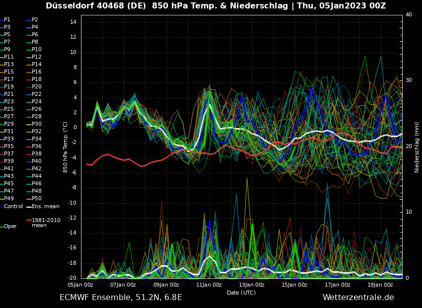Interessant ist in dem Zusammenhang, dass das erste Szenario gar nicht mehr berechnet wird. Zwar stürzt der Hauptlauf zum 14. Januar einmal richtig ab auf dauerfrostverdächtige Temperaturen. Diese trockene Omega-Wetterlage ist im Ensemble aber kaum abgebildet, so richtig deutlich kühler soll es aber mittelfristig erstmal nicht werden.