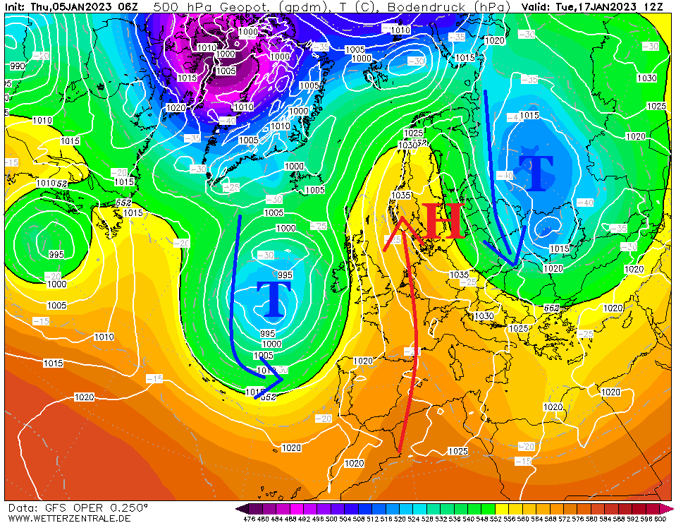 Jetzt baut das amerikanische GFS in seinem Hauptlauf an einem 3. Szenario, denn dieses baut an einer Omega-Wetterlage. Hoch über Deutschland, welches von zwei Tiefs flankiert wird. Zur jetzigen Jahreszeit wäre das nicht unbedingt sonniges und warmes Wetter, könnte auch durchaus ne ziemlich graue Suppe sein, kommt auf den Wind an. Wollte es nur erwähnt haben, dass das GFS noch etwas in Petto hat und keineswegs gemeißelt ist, in welche Richtung es geht. Das Hoch bleibt aber wetterentscheidend.