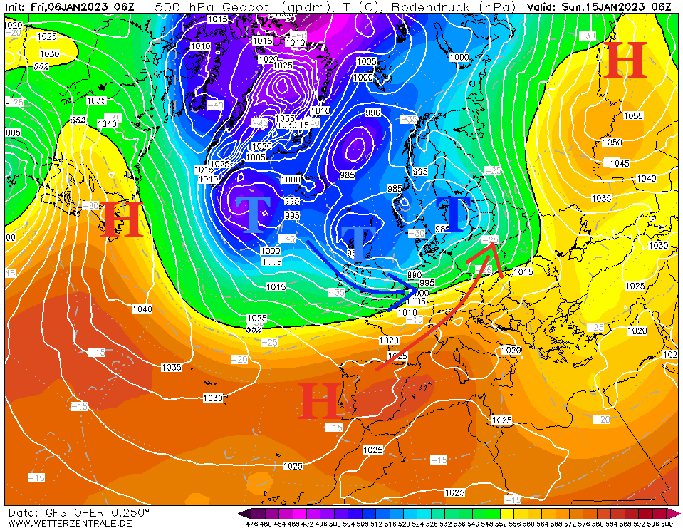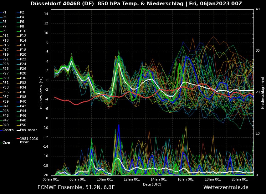 Ein Grundsatz, den ich in den Ensembles selten mit verwende: Je weiter die Linien auseinander liegen, desto unsicher ist die Vorhersage. Und man sieht gerade an den Tagen zwischen Sonntag und Samstag folgende Woche eine große Einigkeit der Modelle, was Temperaturen angeht, allerdings tauchen im Detail immer wieder kleine Ausreißer aus, siehe 9. Januar an den Temperaturen oder im Raum 10. – 13. Januar am Niederschlag. Und deshalb ist die Prognose aktuell noch so schwierig, weil nicht genau zu sagen ist, was genau wann passieren wird. Es soll nur Sturmtief auf Sturmtief folgen, ohne größere Auswirkungen bei uns, stand jetzt.