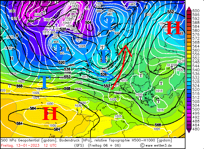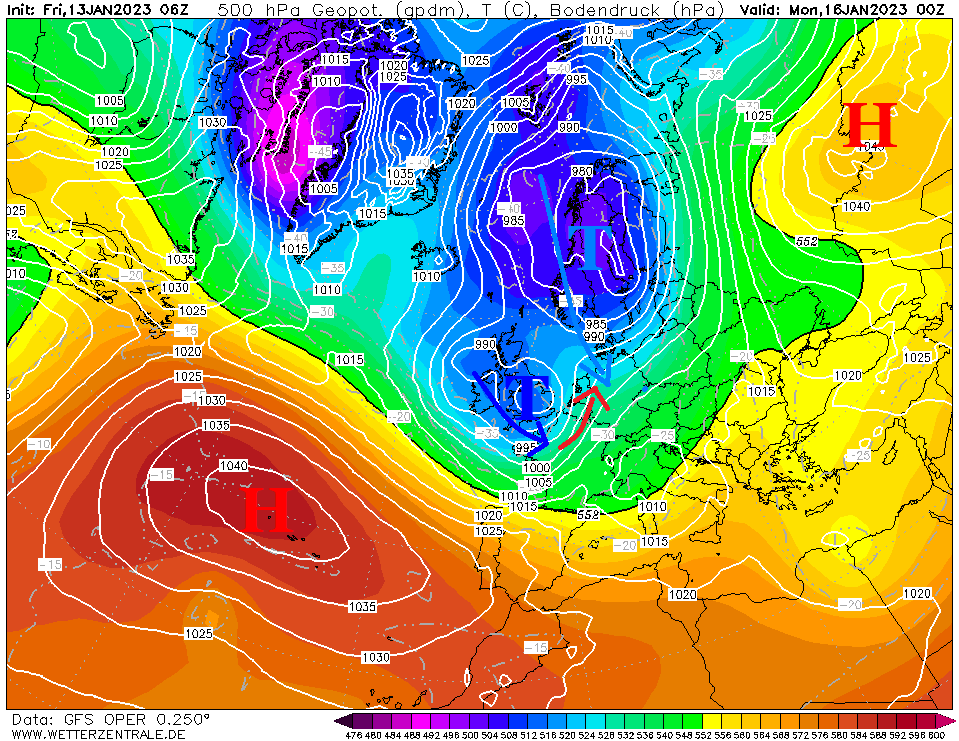 Ihr werdet gerade in der Tabelle sicherlich kurz aufgeschreckt sein. Was denn nun für den Montag? Regen, oder Schnee? Noch etwas milder oder frostig? Das Zünglein an der Waage ist das Tief über den britischen Inseln. Nach dem amerikanischen GFS-Modell, welches ihr auch in der Grafik seht, soll dieses über den britischen Inseln und etwas eigenständig organisiert liegen. Damit gibt es auch eine „Warmfront“, die uns noch etwas eher mildere Luft bringt, die noch keinen Schnee und Frost zulässt. Das ECMWF macht es anders, dort ist das Tief nicht so stark ausgeprägt und die kalte Luft vom Tief über Skandinavien könnte besser zu uns durchstoßen. Deshalb ist es jetzt noch nicht möglich zu prognostizieren, was uns genau ab der kommenden Woche erwartet. Da müssen wir also noch etwas abwarten. Es wird aber das Ende der Sturmphase sein.