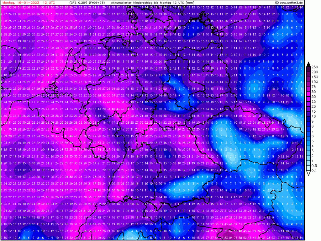 Durch die zahlreichen Niederschläge der vergangenen Stunden, die insbesondere im bergischen Land sowie im Raum östlich von Wuppertal bis zu 90 Liter pro m² in den vergangenen 48 Stunden hinterlassen haben, ist es entlang der Wupper und einzelnen Bächen zu Hochwasser gekommen. Diese Lage wird sich erstmal entspannen, über das Wochenende sollen weitere 40 Liter pro m² in dieser Region folgen, sodass sich die Lage dort nochmal zuspitzen könnte. Eine Situation, wie wir sie im Juli 2021 erlebt haben, wird es aber nicht geben. Die Wupper führt aktuell 4 Mal höheres Wasser als normal, dort gehen die Pegel allerdings schon leicht zurück. Der Rhein führt ebenfalls derzeit viel Wasser, der Pegel lag um 12 Uhr bei 4,75 Meter und damit gut 86 % über dem Mittel. Hier wird der Pegel noch etwas weiter steigen, zu Hochwasser wird es allerdings nicht kommen, denn die Niederschläge lassen nach dem Montag allmählich nach.
