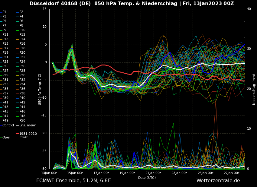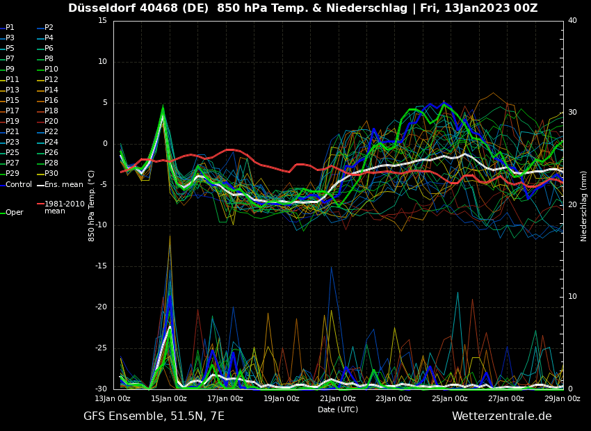 Das ECMWF sieht das im Prinzip ähnlich, auch hier soll gerade der Montag deutlich kühler werden, auch wenn hier das Mittel mit -5 °C nur ganz leicht kühler ist als beim GFS. Ebenso hier soll es immer wieder zu Schneefällen kommen in Richtung nächster Woche. Tendenziell soll es nach dem ECMWF nach der kühlen Phase bis zum nächsten Wochenende eher die mildere Luft zurückkommen als noch nach dem GFS. Beide Modelle sind aber recht trocken.