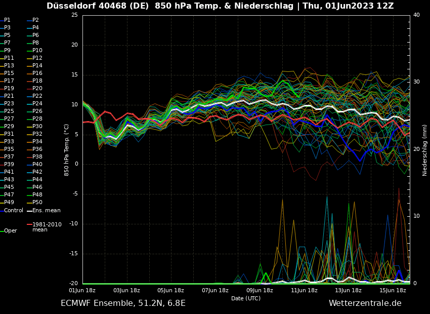 Die trockene und warme Witterungsphase sieht man auch ganz gut im Ensemble des GFS abgebildet. Während die Temperaturen in 1.500 Meter Höhe leicht überdurchschnittlich sind und die in Richtung 10 °C in 1.500 Meter Höhe wandern, was in etwa 25-28 °C je nach Bewölkung bedeutet, sind die Niederschläge sehr rar gesät. Etwas Musik kommt dann ab dem 11. Juni ins Spiel, allerdings auch nicht so übermäßig viel.