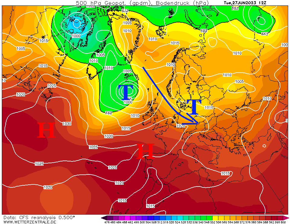 - Ich werde mir gleich die Großwetterlagen zum 27. Juni, 2. Juli und 7. Juli anschauen und dabei nicht die jeweilig dazugehörigen Wetterkonstellationen erklären, sondern die Muster hinter diesen Großwetterlagen beleuchten. Diese werden für die kommenden 6 Wochen interessant sein und darüber entscheiden, welches Wetter ungefähr in diesem Zeitraum in welcher Abfolge entstehen wird.