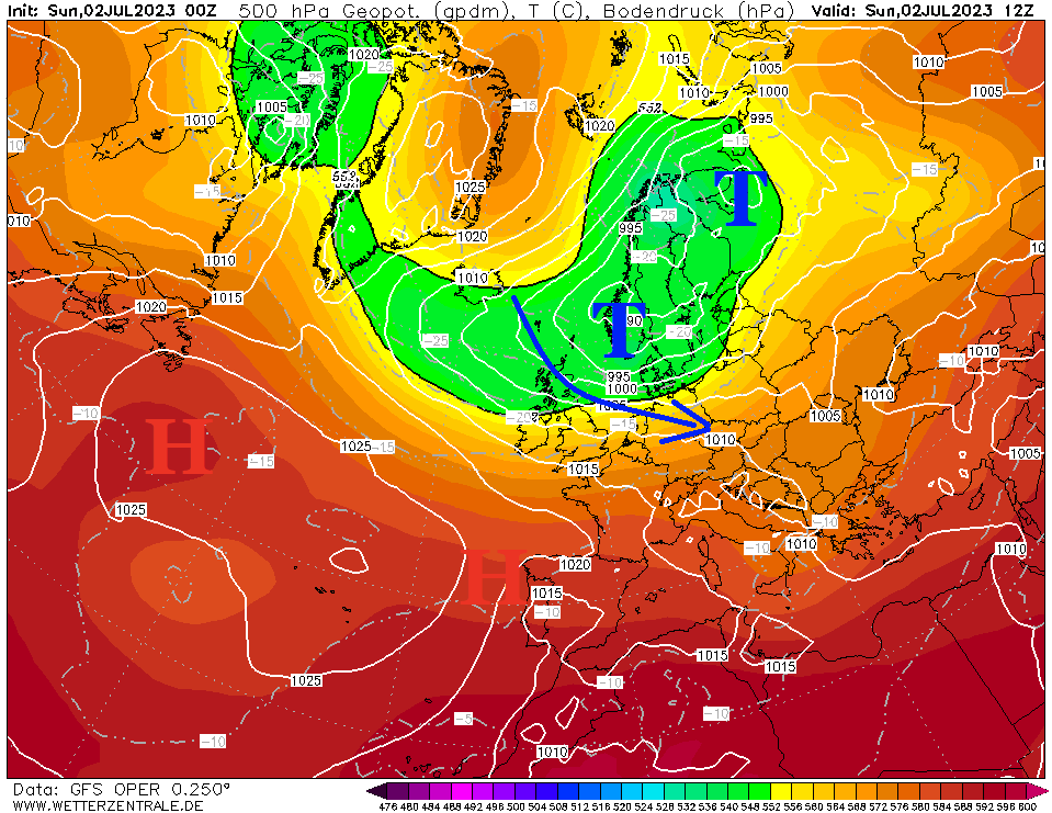 - Sobald das Tief sich von Island in Richtung Südwesten verlagert, dreht bei uns die Strömung auf Südwest und wir kommen in eine Luftmasse, die typisch für kurze Hitzephasen mit anschließender Abkühlung durch Schauer und Gewitter ist.