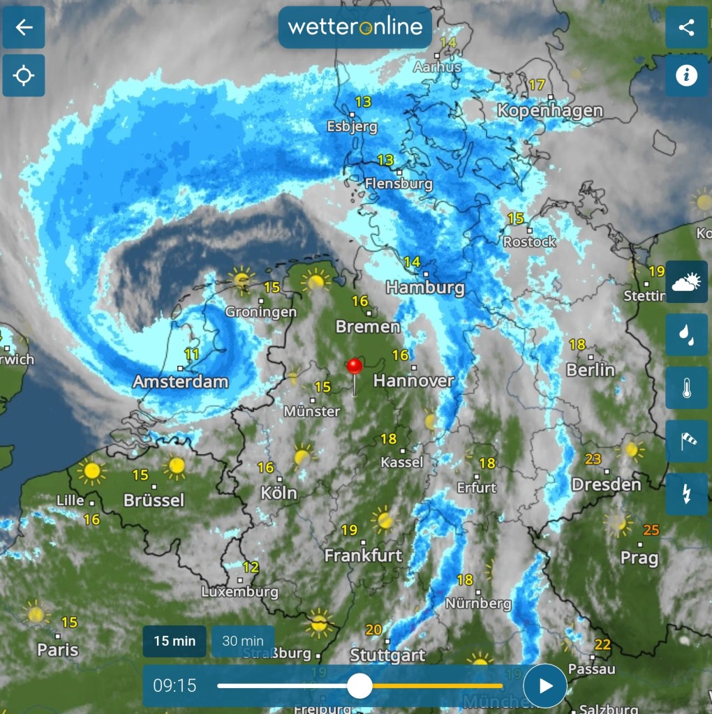Das Radarbild sieht heute fantastisch aus. Bei Amsterdam sehen wir das Zentrum des heutigen Sturmtiefs. Von dem Sturmtief aus beginnt ein Starkregenband um das Tief herum gekringelt bis nach Niedersachen und mit Unterbrechungen bis zum Bodensee. Hinter diesem Regenband reißen die Wolken, ein Kaltsektor zieht ein und hinter der Kaltfront ist häufig wolkenlos. Hier ist die Luft zwar labil, aber erst mit Sonneneinstrahlung setzt die Wolkenbildung wieder ein. Mit den Wolken zieht die Okklussion auf, die nun auch meinen Standort in Ostwestfalen erreicht. Das sind die Quellwolken, aus denen im Tagesverlauf Schauer und vereinzelte Gewitter entstehen.