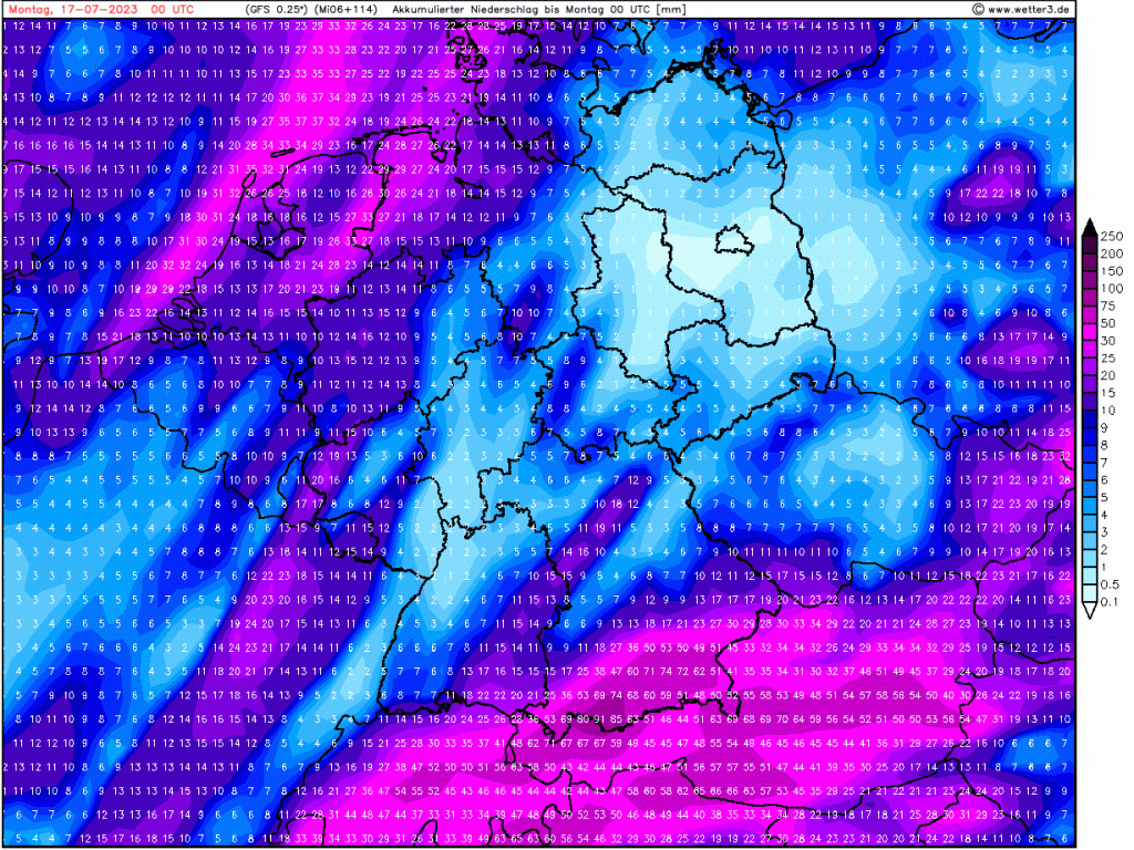 Szenario 1 wäre dabei, dass die Heißluft bis 30+ °C zu uns durchbricht und die Schauer & Gewitter mit Starkregen entstehen lässt. Szenario 2 hält uns von der Heißluft fern, die Kaltfront kommt besser zu uns durch und bringt „nur“ intensiveren Landregen. So etwa 10-20, örtlich 30 Liter pro m², stehen dabei im Raum. Das werde ich für Freitag mal im Auge behalten.