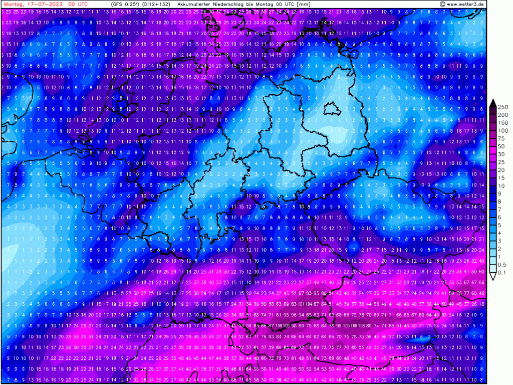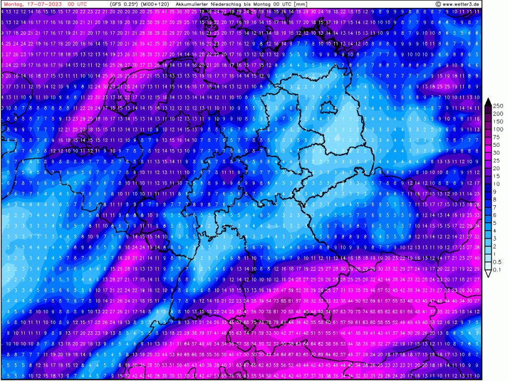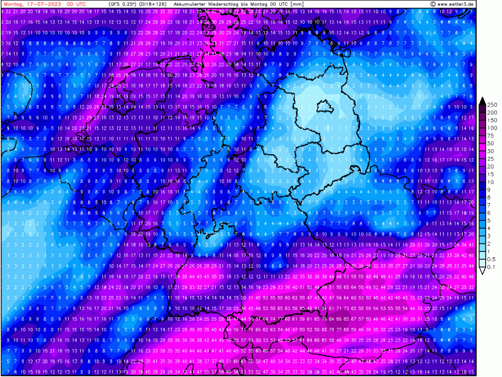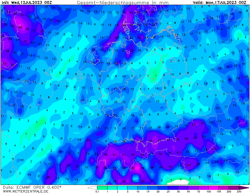 Das europäische ECMWF macht das ein bisschen anders, die Grundzüge sind aber ähnlich. Schauer und Gewitter eher über Niedersachsen, wir liegen am Rande dieser Zone.