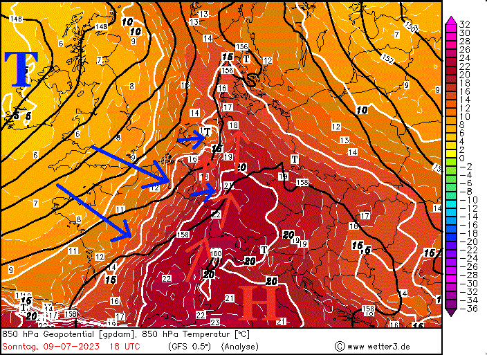 Zoomen wir etwas nach Deutschland rein. Dort haben wir im Nordwesten das Tief, im Süden das Hoch und diese Hitze, die von Süd nach Nord geströmt ist. Diese wird von dem Tief nun nach Osten abgedrängt, an der Luftmassengrenze entstanden Schauer- und Gewitter, örtlich mit Unwettergefahr. Soweit so gut. Jetzt beobachten wir mal die dicken weißen Linien. Die Linie, an der die schwarze 20 angebracht ist, macht beim Übergang von Frankreich nach Deutschland einen kleinen Knick und haut dann nach Osten ab. Die Linie, an der die schwarze 15 angebracht ist, macht einen deutlicheren Knick bei Holland bzw. über dem Westen von Niedersachsen in Richtung Nordsee. Diese Knicke stehen für kleine Tiefs, die die Luft nochmal etwas zusätzlich ankurbeln und zirkulieren lassen.