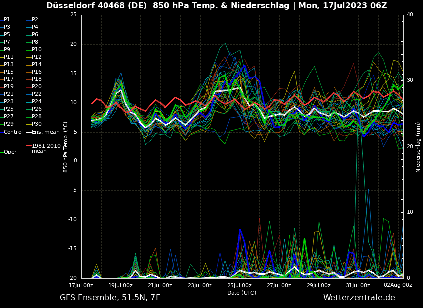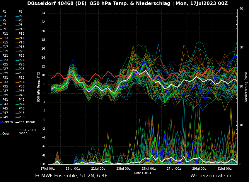 Das ECMWF macht das ein bisschen spektakulärer. Zunächst bleiben die Temperaturen gerade so auf langjährigem Mittel-Niveau mit Temperaturen um 11 °C in 1.500 Meter Höhe, der Hauptlauf schafft es auf 12 °C. Damit würden wir gerade so auf 25-27 °C kommen, dafür gibt es aber deutlich mehr Niederschlagssignale in Form von Schauern und Gewittern. Die Schauer und Gewitter bleiben uns bei unterdurchschnittlichen Temperaturen, ähnlich wie beim GFS, bis zum Monatsende erhalten.