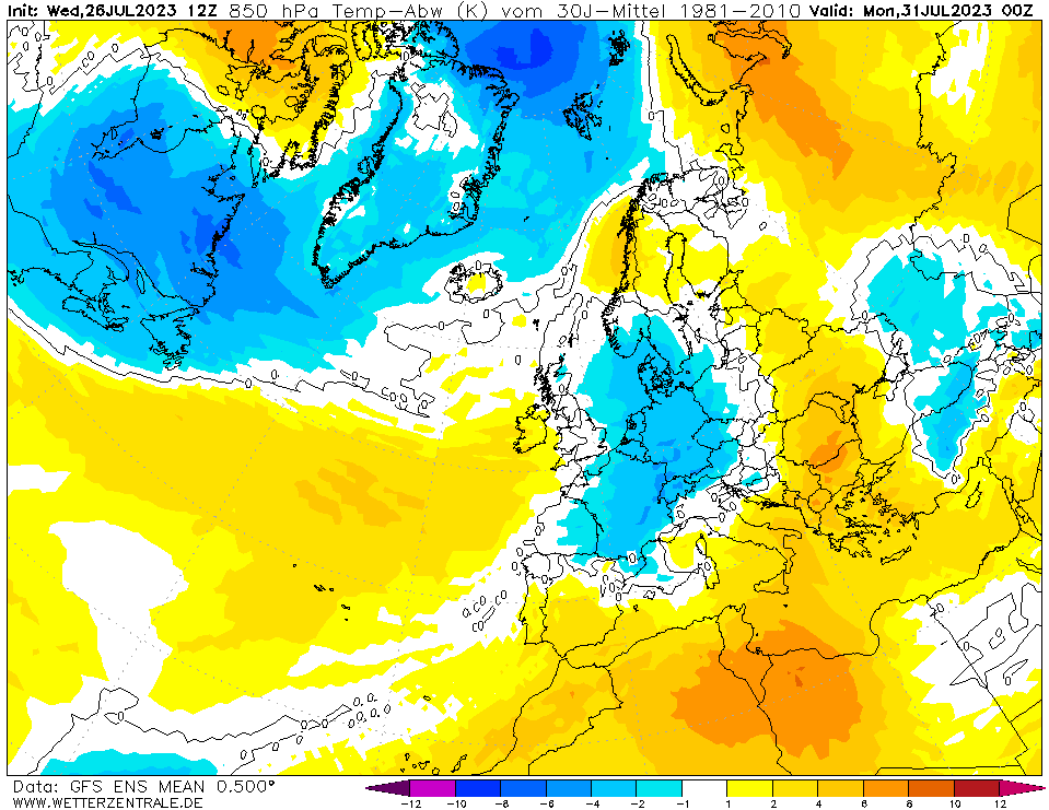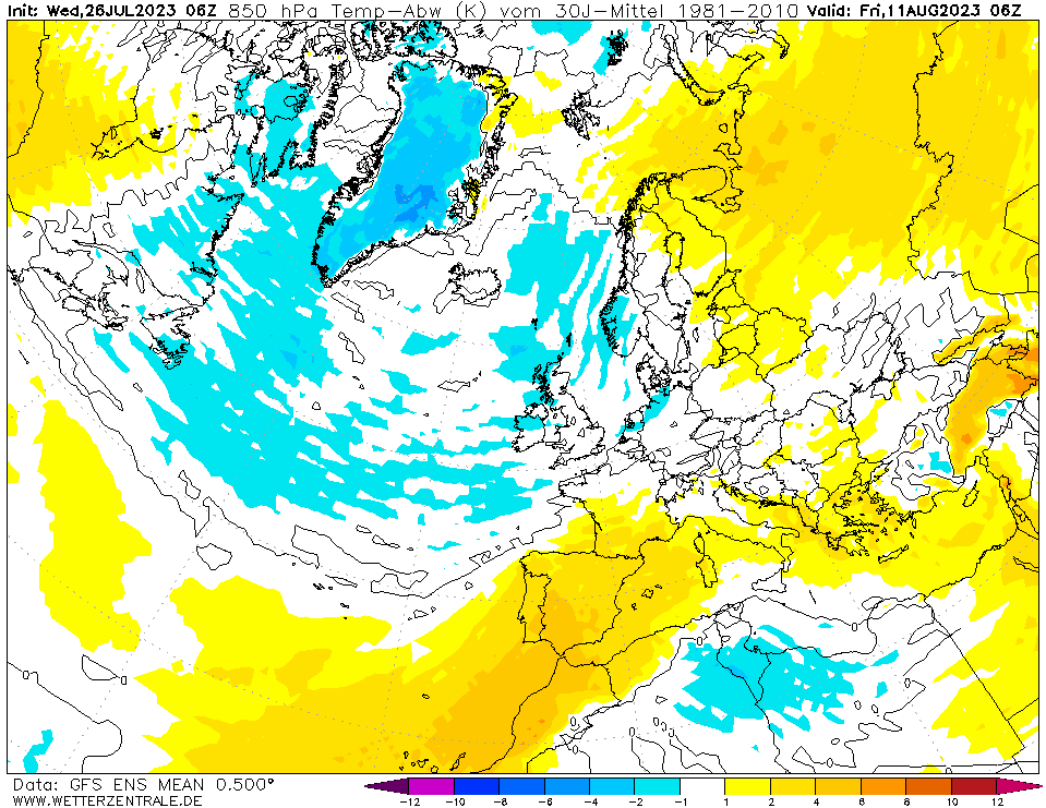 Das kann man an dieser Karte auch ganz gut erkennen. Die Temperaturen sind recht stabil über dem Atlantik, nördlich der Azoren überdurchschnittlich, was dort für ein Hoch spricht. Hingegen kühl über Deutschland, was dort für Tiefdruck steht. Und diese Karte spielen wir einfach mal bis Mitte August weiter.