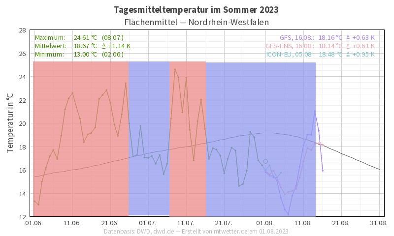 Diese Grafik habe ich einmal etwas bekleistert, sodass ich die warmen Phasen mit rot, die kalten Phasen mit blau markiert habe. Interessant dabei: Der Start in den Sommer bis zum 26. Juni war war bis heiß, danach kam eine kühle und nasse Phase. Mit einer kurzen Unterbrechung rund um den 11. Juli ging es dann bis heute kalt weiter. 26. Juni? Da war doch was!