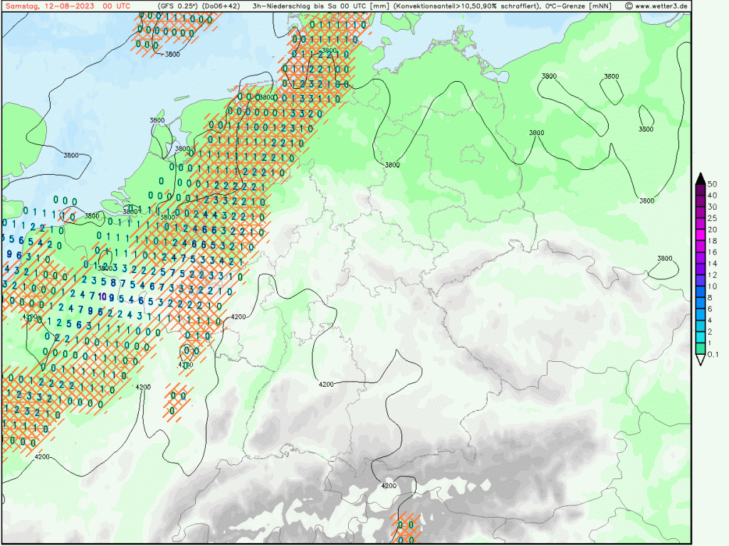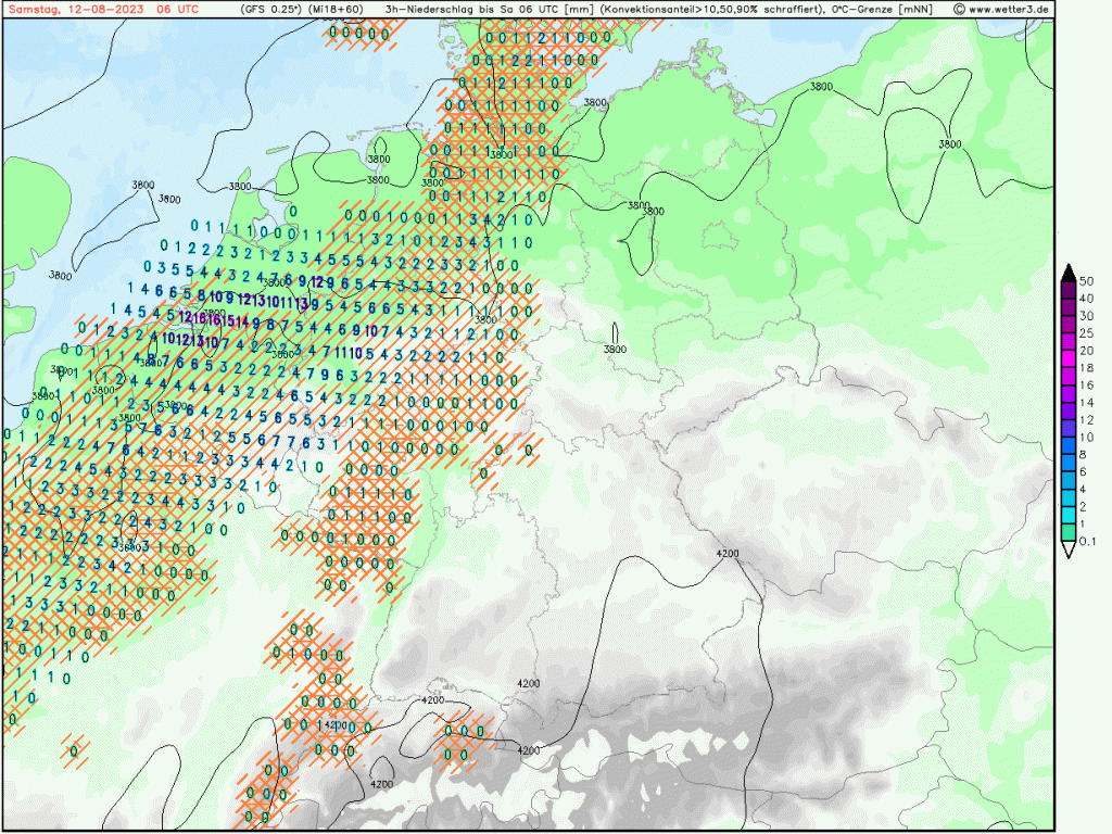Beginnen möchte ich mit dem 18er Lauf von gestern Abend. Kurz zur Erklärung: Die Zahlen stehen für die Liter, die pro m² binnen 3 Stunden fallen sollen. Wenn nur eine Zahl dort steht, sprechen wir von stratiformen Regen, also Landregen. Ist dort ein Schrägstrich in orange dabei, ist es eine Mischung aus Landregen und Schauern, bei kreuzenden orangenen Strichen ist es konvektiver Regen, also Schauer / Gewitter. Der 18er geht von der stärksten Ausprägung des Regens zur zweiten Nachthälfte zum Samstag aus mit maximal 11 Liter pro m² binnen 3 Stunden, das wäre schon ordentlich. Bis zum Mittag sollen dann weitere Schauer über uns hinwegziehen, danach reißt der Himmel kurz auf.