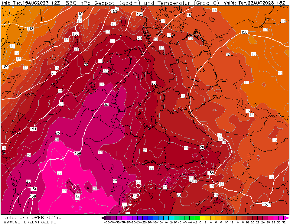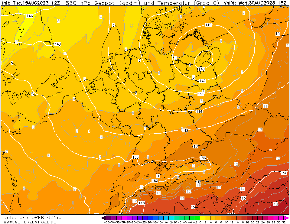Guckt euch mal diese Berechnung an. Der Dienstagabend mit einer Luftmasse, die förmlich „Wüste“ schreit. Temperaturen in 1.500 Meter Höhe von an die 25 °C-Marke, sowas erleben wir im Westen von Deutschland äußerst selten. Wenn man den 8. August 2003 mit 38,5 °C und den 19. Juli 2022 mit 38,2 °C heranzieht, hatten diese beiden Tage eine Luftmassentemperatur von 22 °C in 1.500 Meter Höhe. Daran sieht man bereits, wie außergewöhnlich dies wäre. Ich spoilere schon mal etwas: Es ist ein Extremlauf, der Extremste um es genau zu sagen.