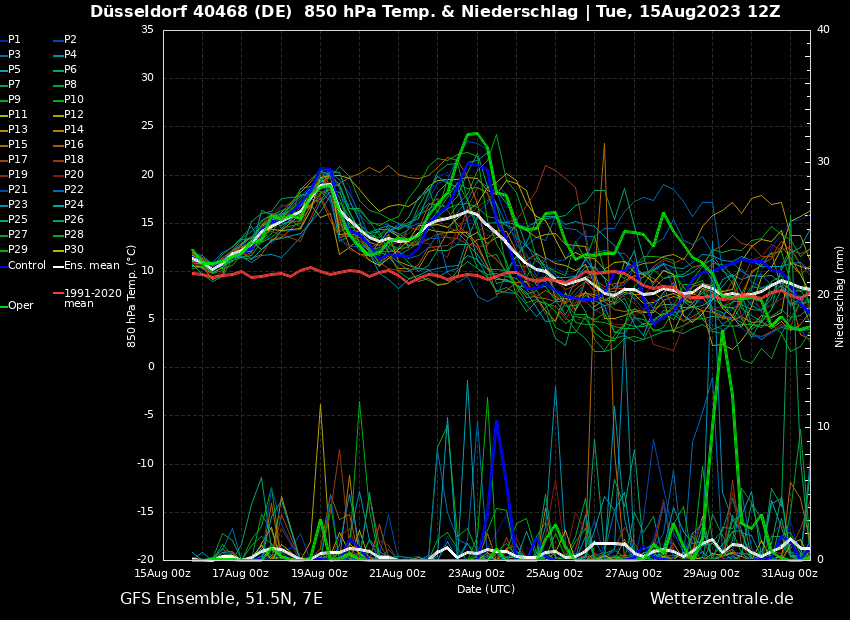Gleichen wir das einmal mit dem Ensemble ab. Wir liegen gerade bei durchschnittlichen Temperaturen mit leichtem Schauerrisiko, die Temperaturen steigen nun von Tag zu Tag wieder an, dazu gibt es zwischendurch mal Schauer und Gewitter. Der erste Wärmepeak soll zum Samstag erreicht werden mit über 30 °C. Danach wird es nochmal kurz kühler mit Sonne, ehe ein zweiter Wärmepeak aufziehen. Im Mittel liegen die Temperaturen „nur“ bei 16 °C in 1.500 Meter Höhe, das kühler als der erste Peak wäre und wir auch nur 30 °C zum zweiten Wärmepeak bekommen würden. Der Hauptlauf ist dabei ein Extremlauf, wird aber immer wieder berechnet. Nach diesem 22. August gehen die Temperaturen dann geschlossen in Richtung langjähriges Mittel mit Temperaturen unter 25 °C, einzelne Modelle wandern sogar noch weiter runter mit Niederschlägen, Wind und kühlen Temperaturen. Das wäre ein erster Herbsteinbruch, aber auch das ist noch ganz schön weit weg.