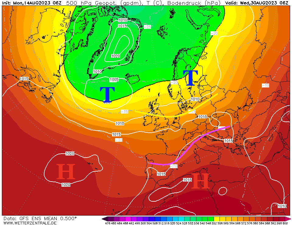 11 Tage später soll sich die stabile Luft wieder bis zum Mittelmeer zurückziehen und wir gelangen mehr und mehr in die labile Luft aus dem Norden. Die Tiefs übernehmen wieder über Nordeuropa und damit steigt für uns wieder die Herbstneigung. Der Hochsommer soll also nicht lange bleiben.