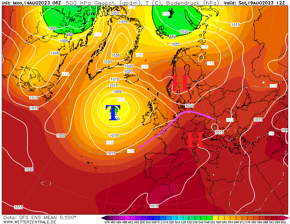 Bis Samstag zieht sich die labile Luft zurück und die Hitze aus dem Süden stülpt sich über Deutschland bis an die Küsten, womit wir auch für kurze Zeit unter die stabile Luft kommen, unter der es heiß wird. Welche Temperaturen das dann bedeutet, schauen wir uns gleich an. Das Tief über dem Nordatlantik zieht sich zurück, das Skandinavien-Hoch macht den Weg frei für ein enorm hohes Geopotential in 5.500 Meter Höhe, was dann ebenfalls für das stabile Wetter sorgt. Ihr könnt euch das Vorstellen als eine Art Glocke an hohem Luftdruck, der sich in 5.500 Meter Höhe über die Atmosphäre darunter legt und eine Wolkenentwicklung über diese Höhe hinaus verhindert. Somit werden die Schauer und Gewitter im Keim erstickt.