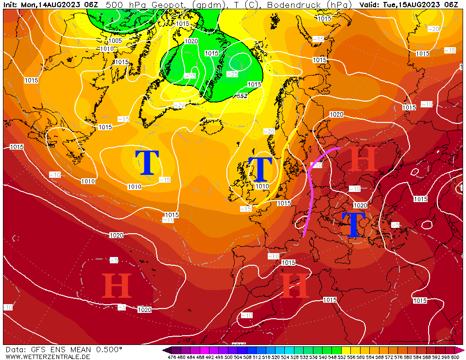 Das ist die heutige Konstellation. Ein Hoch über der Ukraine bringt mit einem Tief über der Nordsee eine feuchte und heiße Luft nach Deutschland. Dazu habe ich mal die -10 °C (stabile Luft) Isotherme in violett sowie die -15 °C (labile Luft) in gelb eingezeichnet. Wir liegen genau dazwischen und haben dabei einen Mix aus Sonne, Wolken und vor allem höherer Luftfeuchtigkeit, die Schauer und Gewitter produziert, wie in der vergangenen Nacht.