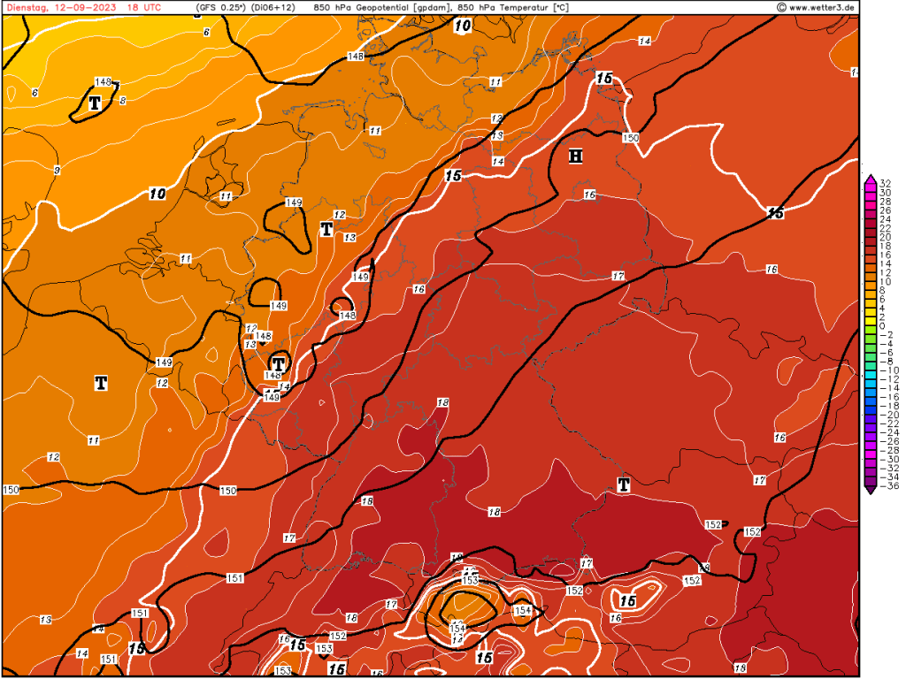 Wir liegen westlich davon und dort wird die Kaltfront liegen, die dann weiter nach Südost ziehen wird. An der Kaltfront wird es ergiebige Regenfälle geben, auch wenn diese nicht mehr den Starkregen bringen werden, wie er gestern noch berechnet worden ist. An der Kaltfront selbst wird der Wind kurzzeitig etwas aufleben, aber mehr als 40 km/h wird es voraussichtlich nicht geben. Mit Durchzug der Kaltfront kühlt es sich ab und die Schwüle nimmt langsam ab. Bis morgen früh folgen weitere Schauer, danach trocknet die Luft und die Sonne kehrt zurück in einem Mix mit Wolken und angenehmen 20 °C.