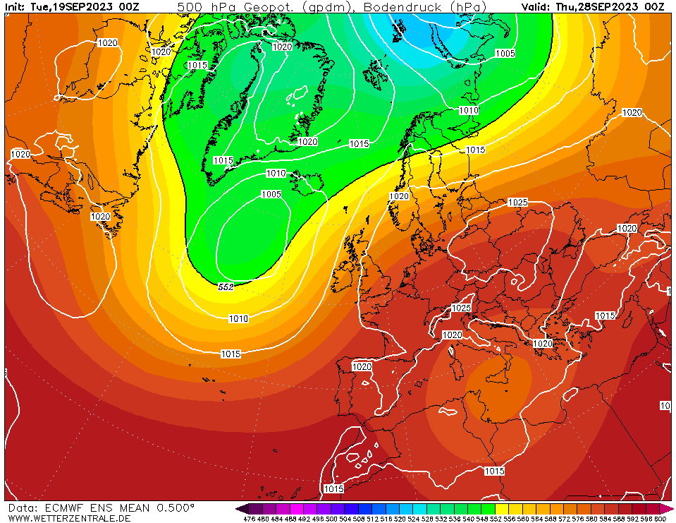 Von einem Höhentief will das europäische ECMWF derweil nichts wissen. Und das ist das gemittelte Modell wohlgemerkt, so sehen das gemittelt alle 50 Einzelberechnungen für in 9 Tagen. So etwas habe ich auch selten gesehen.