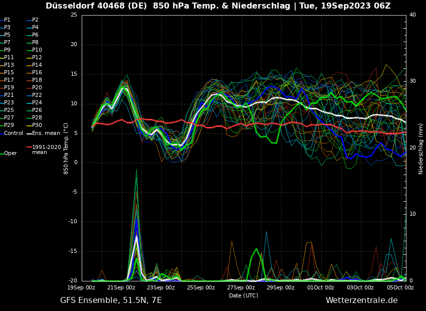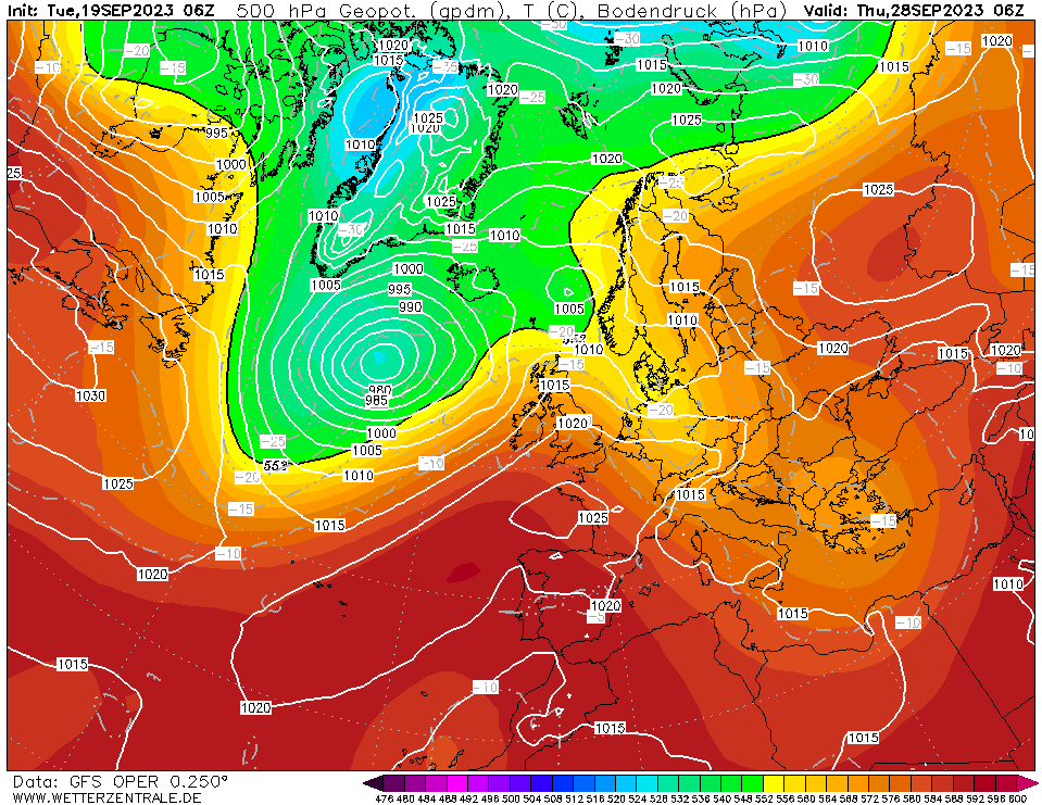 Interessant ist der Hauptlauf, der zum 28. September nochmal abstürzt und Regen bringt, ehe er sich wieder erholt und weiter Trockenheit bringt. Das liegt daran, dass sich in dem aufbauenden Hoch ein Kaltlufttropfen in der Höhe einnisten würde, welches mal kurz kühlere Temperaturen und Regen bringen würde. Ganz allgemein sieht die Großwetterlage aber folgendermaßen aus: