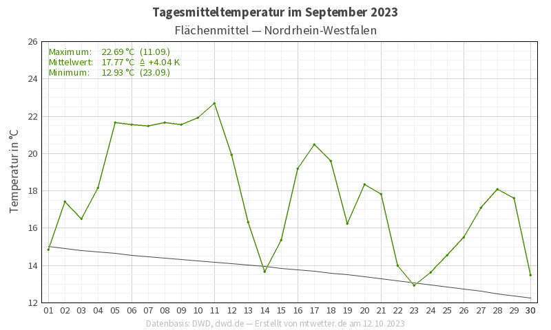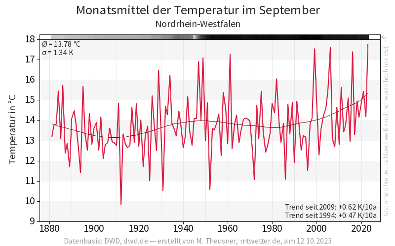 Die Temperatur lag gemittelt in NRW bei fast 18 °C, was schon an einen gewöhnlichen Sommermonat erinnert. Damit war der September 2023 der wärmste Septembermonat seit Aufzeichnungsbeginn, vor 2006, 1999, 2016 und 1961. Die Temperaturen steigen derzeit um 0,47 °C (seit 1994) und 0,62 °C (seit 2009) binnen 10 Jahre an. Das Mittel der Temperaturen soll somit bis 2033 bei etwa 18,5 °C liegen. Zum Vergleich: Das entspricht einem durchschnittlichen Hundstag Anfang August, den heißesten Tagen des Jahres, aus den Jahren 1981-2010. Im September, gemittelt. Das ist verrückt.