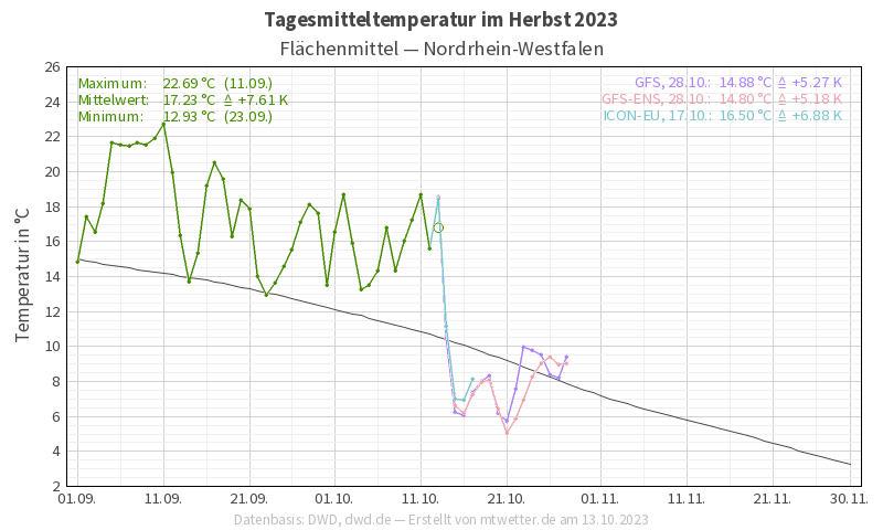 Auf dem Diagramm ist schön zu sehen, dass die Temperaturen, wie bereits gestern schon erwähnt, im September und auch im Oktober deutlich über dem langjährigen Mittel der Jahre 1961-1990 liegen. Mit einem Plus von 7,61 °C gegenüber dem langjährigen Mittel ist es deutlich zu warm, stand jetzt. Wenn die Temperaturen nun zurückgehen werden, werden wir am Ende des Herbstes vermutlich in Richtung +2-3 °C zurückgehen, was aber immer noch für einen rekordverdächtigen Herbst 2023 sprechen würde. Mehr dazu aber zu einem anderen Zeitpunkt. Man erkennt aber schon ganz deutlich, dass dieser Absturz der Temperatur ziemlich markant ist und wir dann auch in der Nähe dieses Temperaturniveaus bleiben, welches für das langjährige Mittel spricht. Morgen wachen wir auf und werden und völlig verwundert die Augen reiben, was denn da draußen los ist. Und die Bäume werden dem gleich tun und ziemlich schnell die Farbe ändern und ihr Kleid abwerfen.