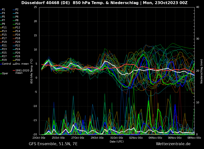 Das kann man insbesondere an den Niederschlagskarten des GFS gut erkennen. Der Hauptlauf, den wir auch oben im Diagramm erkennen können, bringt gerade in NRW vielerorts an die 100 Liter pro m² in den kommenden 16 Tagen. Das scheint mir auch realistisch in Anbetracht der Tatsache, dass die Regenfronten teilweise über 10 Liter pro m² bringen sollen.