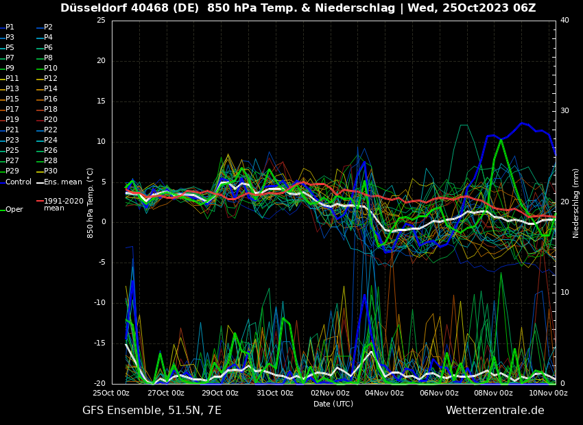 Zum Vergleich werfen wir noch einen Blick auf das ECMWF. Der Temperaturverlauf ist recht ähnlich, geht das ECMWF von einem leichten Frontenwechsel von Warmfront (30. Oktober), Kaltfront (1. November), Warmfront (3. November) und Kaltfront (4. November) aus, sprich etwas mehr Wellenbewegung, was für mehr Wind sprechen würde. Das sehen wir auch in den Niederschlägen, die nach dem ECMWF leicht höher sind als nach dem GFS. Niederschlags-Peaks sind hiernach aber auch der 27.-29. Oktober sowie der 4. November, also relativ ähnlich zum GFS. Oder kurzum: Es bleibt so, häufig nass und ab und zu windig.