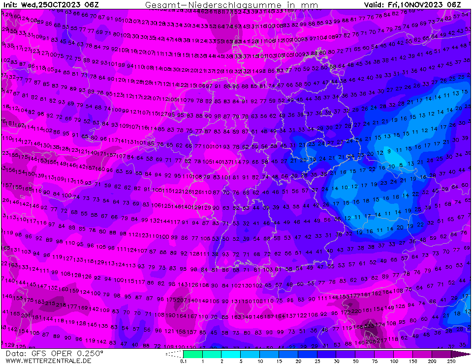 Die ganzen Niederschlagssignale des Hauptlaufs sind im Ensemble ganz gut abgedeckt. In NRW sind weiterhin 70-110 Liter pro m² für die kommenden 16 Tage im Gespräch, im Sauerland bis 140 Liter pro m² durch exponierte Lagen. Die hohen Niederschläge im Vergleich zum Osten kommen durch immer wieder entstehende Luftmassengrenzen zustande. Dieser Lauf ist im Vergleich der anderen 3 zuvor berechneten Modellläufe etwas nasser, es könnte also durchaus auch eine leichte Korrektion nach unten geben, was die real gemessenen Niederschlagssummen angeht.