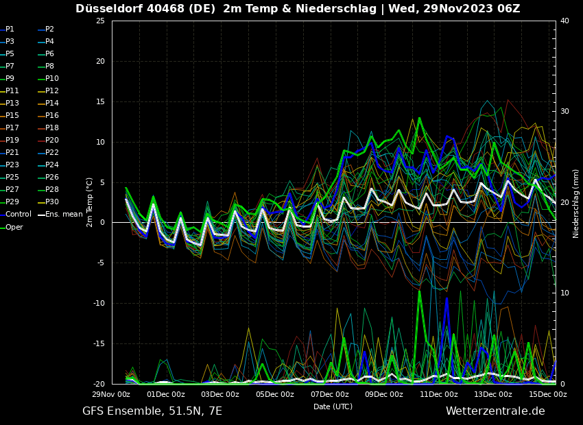 Nach dem amerikanischen GFS soll diese kalte und weitestgehend trockene und graue Wetterlage noch bis zum 6. Dezember, sprich Mittwoch nächster Woche, anhalten. Danach soll sich die Wetterlage wieder auf Westwindwetter umstellen mit Regen und Temperaturen in Richtung 10 °C. Der Hauptlauf turnt dabei bei allen 4 letzten Berechnungen oben herum. Es gibt aber auch noch ein paar Modelle, die kalt bleiben, die sind aber eher in der Minderzahl. Könnte durchaus sein, dass es zu Mitte Dezember wieder mild, regnerisch und windig wird.