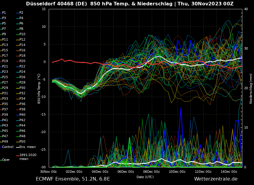 Gestern haben wir ja bereits über den Trend des amerikanischen GFS gesprochen, heute möchte ich das europäische ECMWF mal zu Wort kommen lassen. Dazu sei noch erwähnt, dass gestern die Temperaturen in 2 Meter Höhe abgebildet waren, heute habe ich die bekannte Luftmassentemperatur aus 1.500 Meter Höhe mitgebracht, aus Gründen. Denn: Wir sehen ganz deutlich die arktische Luft über uns liegen bis zum 4. Dezember, dann steigen die Temperaturen an und die Niederschlagssignale nehmen zu. Und das spricht für einen Umschwung im Wetter, da auch die Luftströmung wieder auf West bis Südwest dreht. Mit der milderen Luft wird es wieder windig, deutlich milder (Mittel bewegt sich bei 0 °C, mit Wind sind das 8-10 °C Tageshöchsttemperatur) und richtig nass. Zwar bringen uns die Hauptläufe von ECMWF und GFS „nur“ 20-50 Liter pro m² bis zum 10. Dezember, der gesamte Vorhersagezeitraum bis zum 16. Dezember, also 6 Tage später, würde allerdings nochmal grob 30-50 Liter pro m² hinzubringen. Wir kehren also sehr wahrscheinlich zum Herbstwetter zurück, pünktlich zum Start in den meteorologischen Winter.