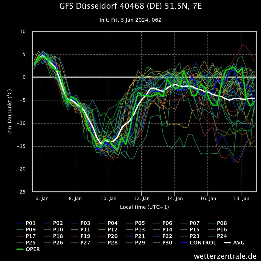 Interessant ist, wenn wir uns das Ensemble mit der Luftmassentemperatur in 1.500 Meter Höhe von gestern ins Gedächtnis rufen, dass die Luft sich ja rund um den 15. Januar erneut deutlich abkühlen soll. Der Taupunkt macht dabei nur einen kleinen Schritt zurück, ob da etwas weißes im Busch ist?