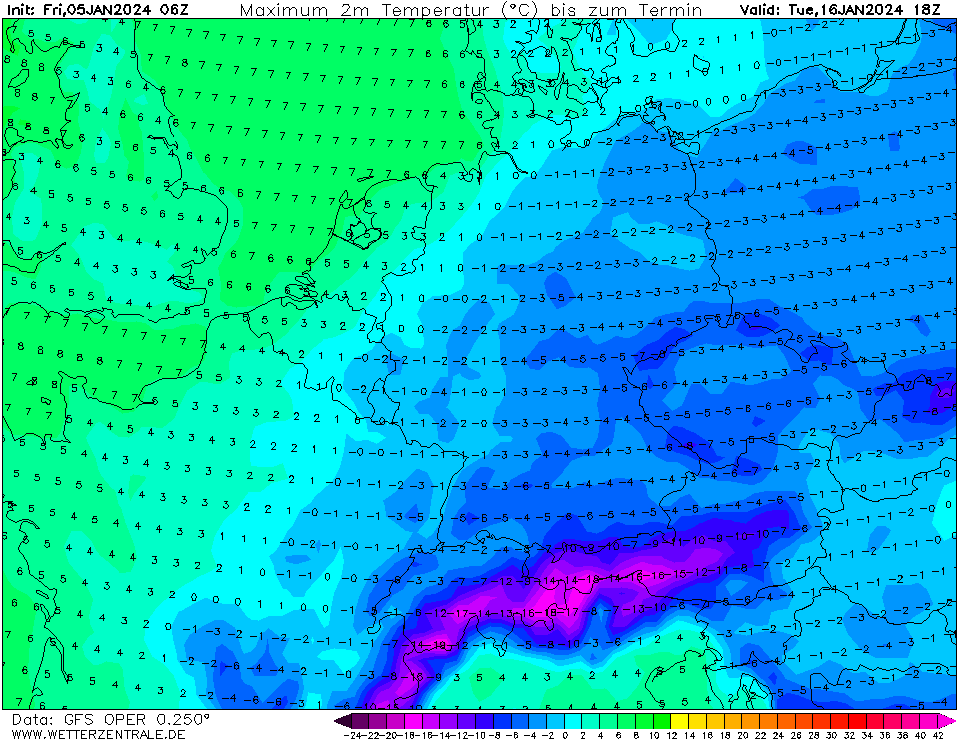 Höchsttemperatur nach dem amerikanischen GFS mit seinem Hauptlauf für den 16. Januar | Quelle: wetterzentrale.de
