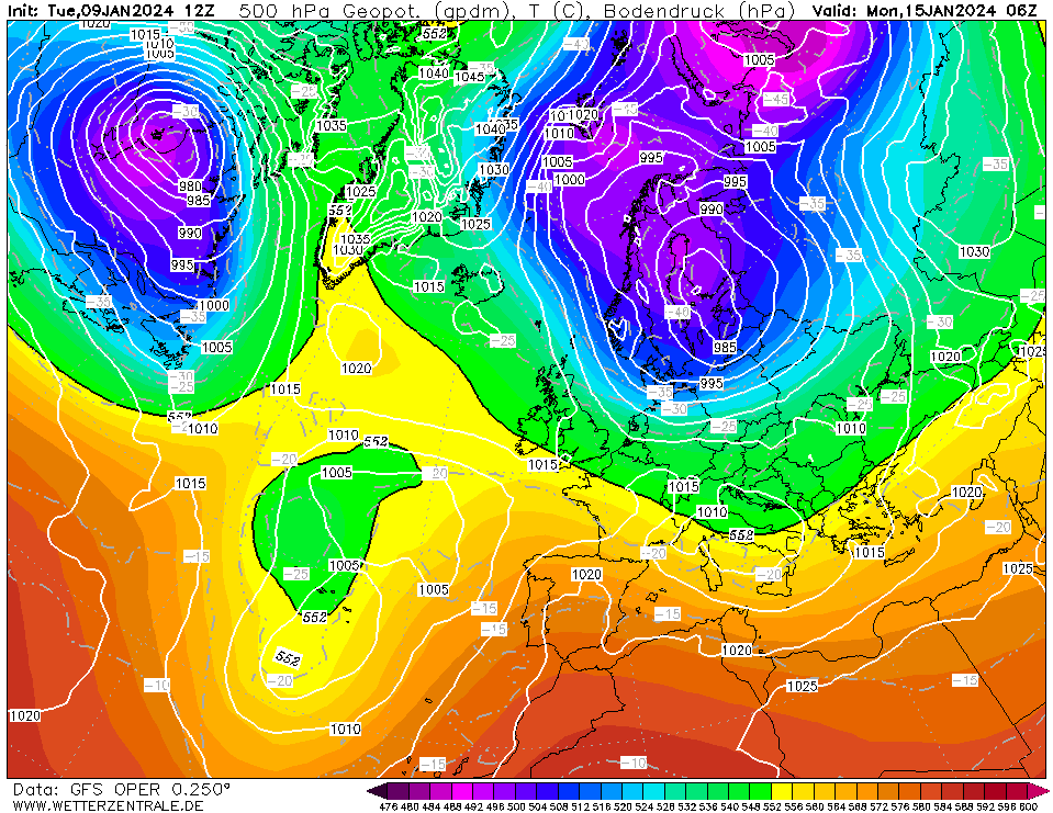 Interessant sind dabei die Temperaturen. Im Zentrum des Tiefs bildet sich ein extrem kalter Kern in der Höhe, sodass die Temperaturen in 5.500 Meter Höhe auf unter -40 °C zurückgehen, was auch für Skandinavien unüblich ist.