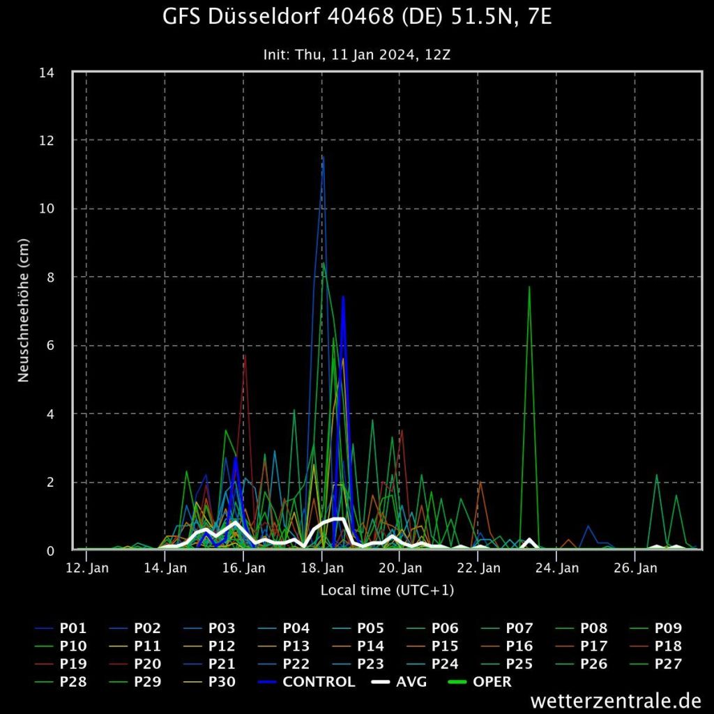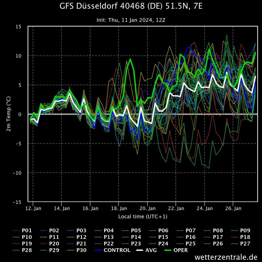 Gestern haben wir bereits gesehen, wo die Reise mit den Temperaturen in 1.500 Meter Höhe hingeht und dass sich die Luft in Richtung Ende Januar erwärmen wird. Die Temperaturen in 2 Meter Höhe haben im Winter eine andere gesonderte Aussagekraft und entsprechend können wir sehen, dass der Frost der Nächte ab dem 16. Januar zurückkehrt und bis 20. Januar bleibt. Da es tagsüber zu Niederschlägen kommen soll, gibt es in der Zeit erhöhte Glättegefahr. Danach wird es deutlich milder.