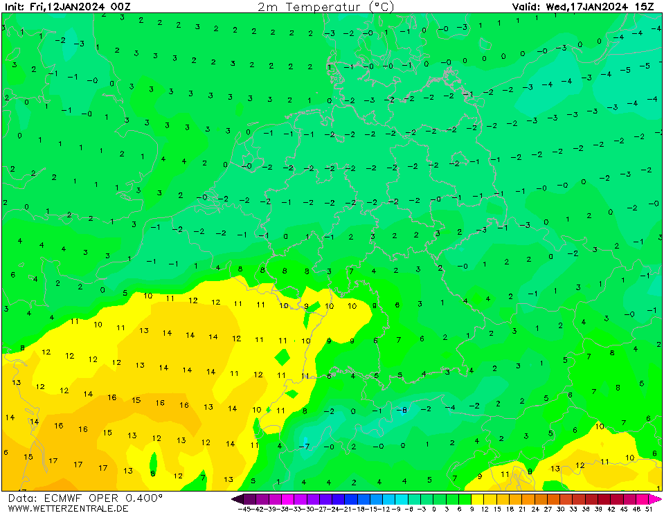 Die dazugehörigen Temperaturen lassen darauf schließen, dass der Niederschlag in diesem Fall ausschließlich als Schnee runter kommen würden, sodass wir schnell mal von 20 cm sprechen würden. Wir sehen aber auch, dass von Südwesten eine sehr milde Luftmasse mitkommt, die uns einen Temperatursprung um 15 °C bringen würde.