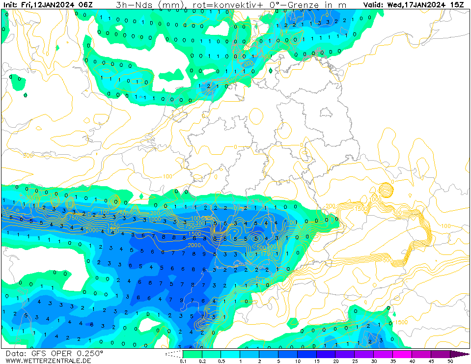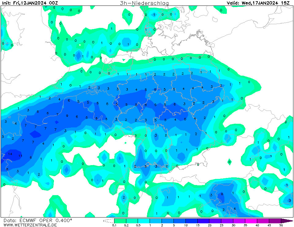 Zu Mitte der nächsten Woche kann sich durchaus eine spannende Wetterlage entwickeln. Am Rande der kalten Luft im Norden und der warmen Luft im Süden wird sich ein Tief vom Atlantik über die Bretagne zu uns bewegen. Dieses Tief zieht, je nach Modell, mit seinem Zentrum zwischen dem südlichen Rheinland-Pfalz und dem südlichen Baden-Württemberg. Wenn dieses Tief, wie nach dem europäischen ECMWF-Hauptlauf gut zu sehen, die nördliche Zugbahn einnimmt, kommen wir in den nördlichen Einflussbereich, wo sich ergiebige Dauerniederschläge an der Luftmassengrenze entwickeln. So kommt über mehrere Stunden hinweg gut 5-6 mm Niederschlag pro 3 Stunden runter.