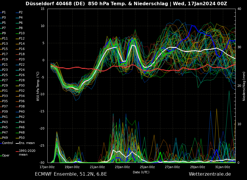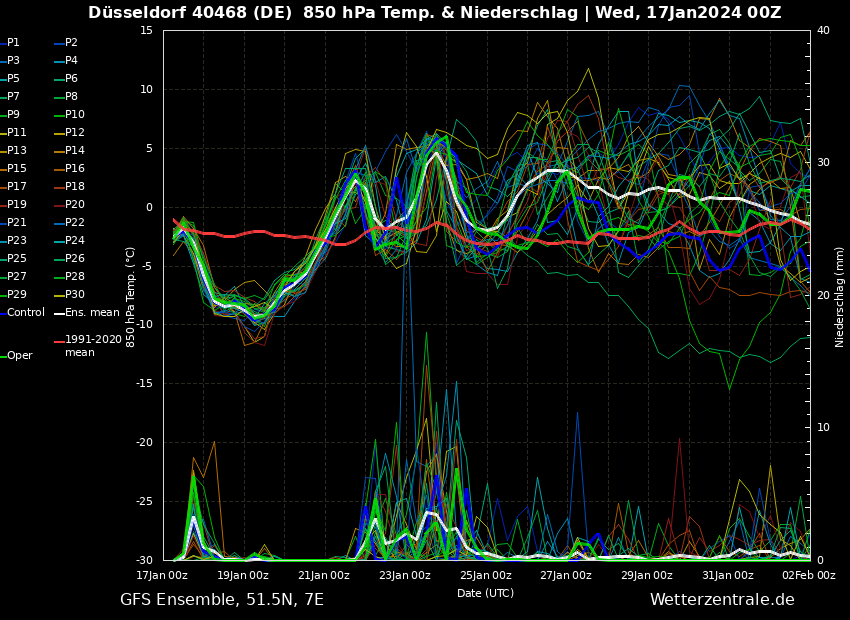 - Diese Achterbahnfahrt der Temperaturen geht auch nach dem 25. Januar weiter, die Temperaturen bleiben auf einem hohen Niveau mit gemittelt 1-3 °C in 1.500 Meter Höhe. Auffällig dazu ist, dass wenige Niederschlagssignale am unteren Bildrand zu erkennen sind.