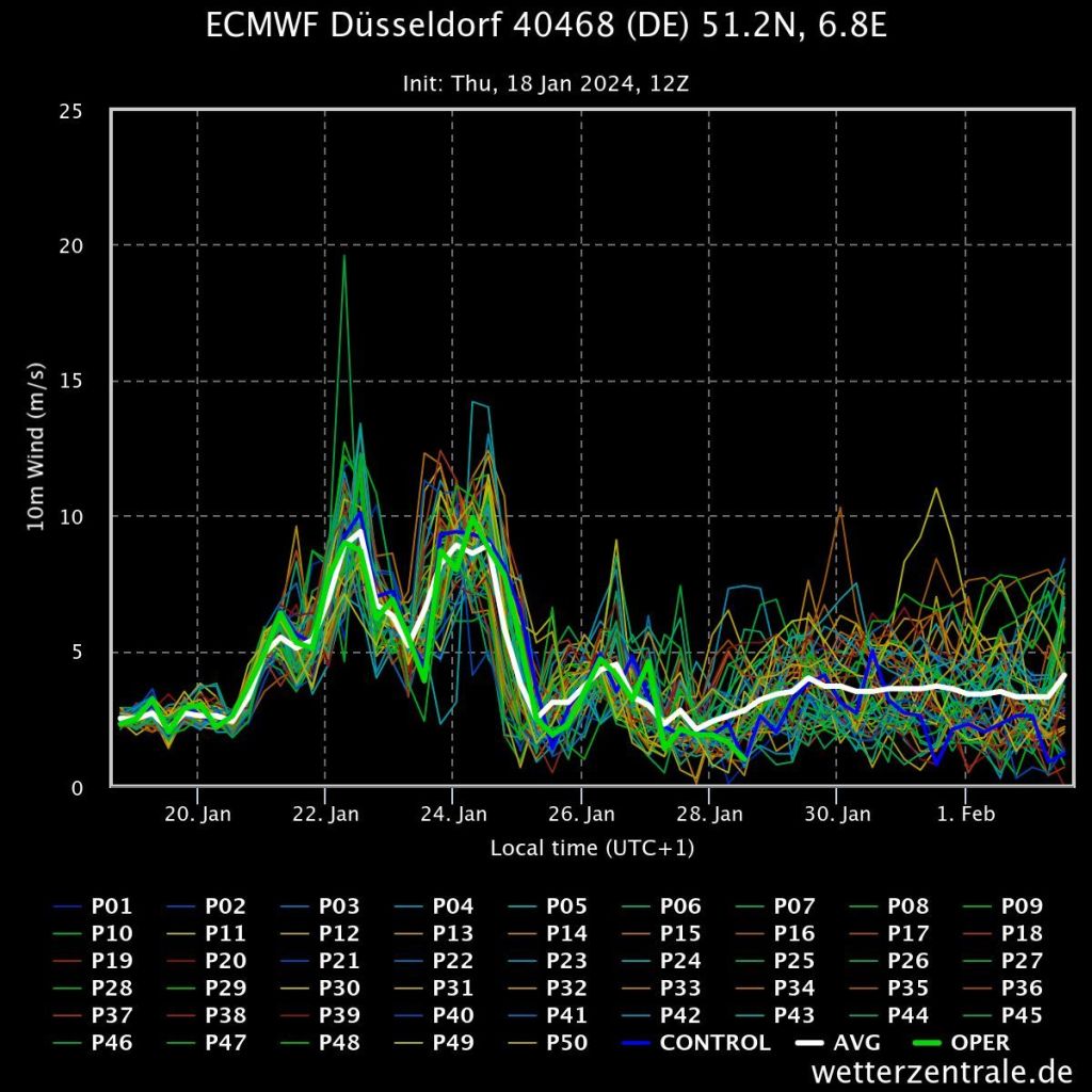 Das ECMWF rechnet aktuell noch mit seinem aktuellen Durchlauf, aber die entscheidenden Tage sind bereits drin. Hier sind die Berechnungen allgemein etwas stärker ausgeprägt, sodass hier z. B. der P27 Lauf den Vogel abschießt mit gemittelt 70 km/h und in Böen 100-115 km/h. Das ist das, was in der Wetterlage steckt und was vor einigen Tagen auch schon mal vom amerikanischen Hauptlauf berechnet worden ist. Das bedeutet aber keineswegs, dass das so kommen soll und wahrscheinlich auch wird.